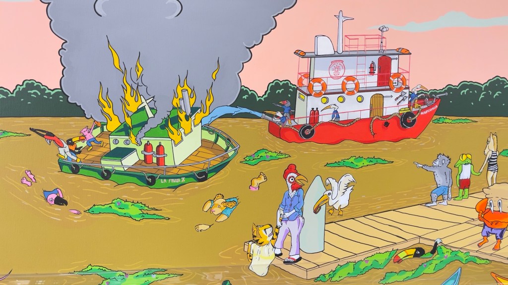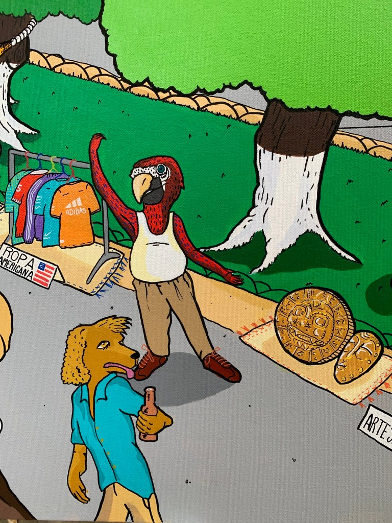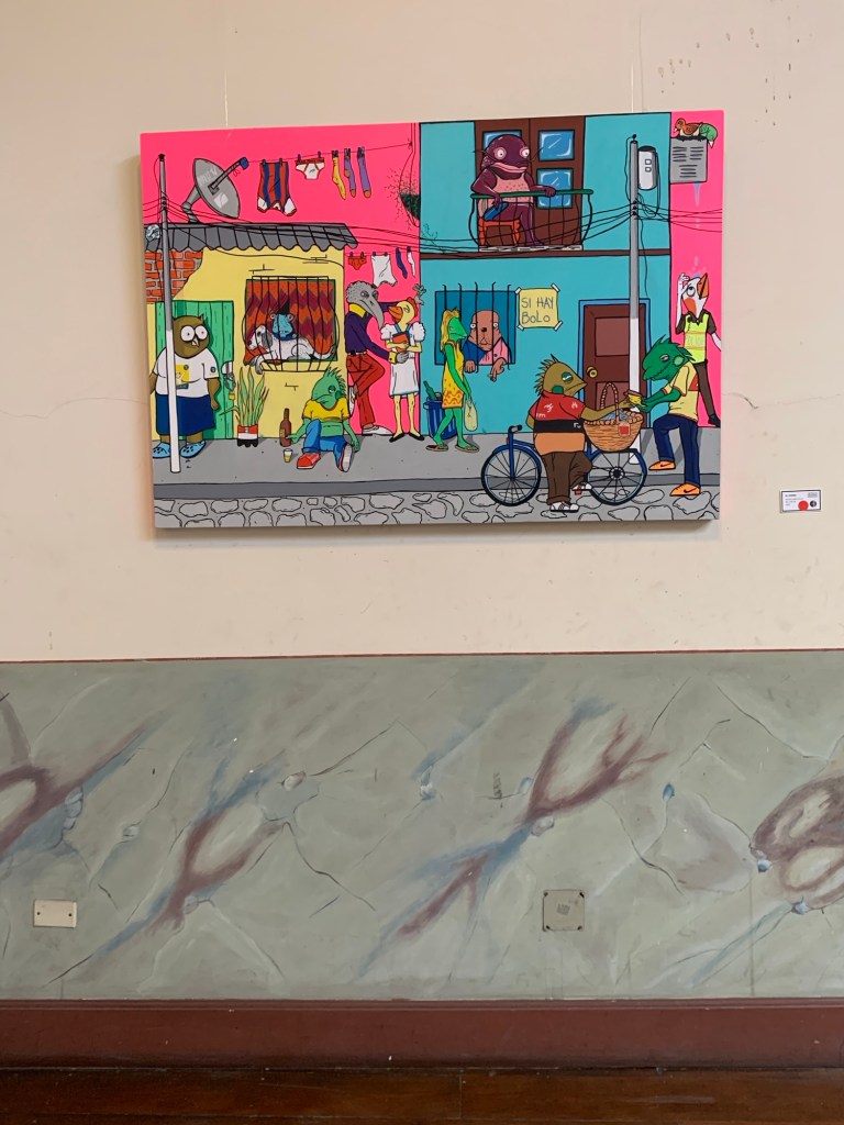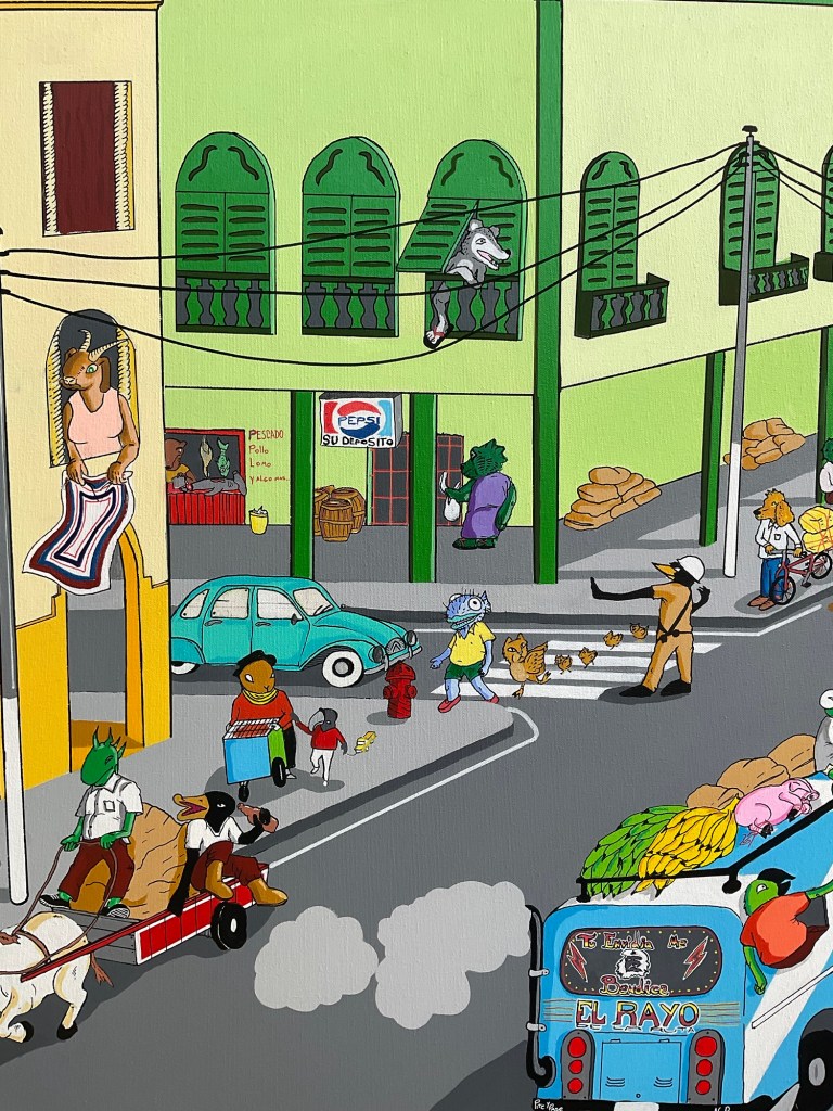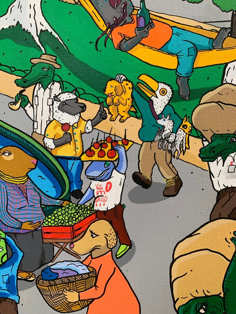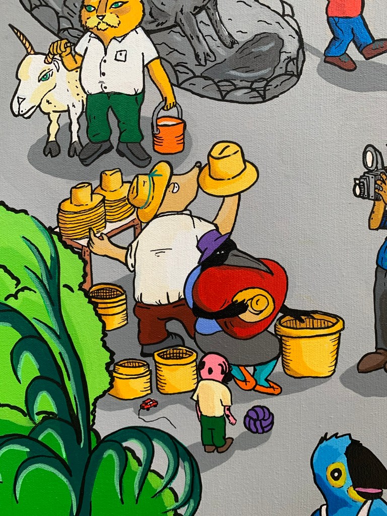 Ciudad Manglar holds together stories of commonplace encounters that shape public life in Guayaquil. The collection magnifies the multiple, often contradictory, characters of the city – their dress, customs, attitudes, narratives and how their subjective qualities bump up against each other and perform in ironic ways. A series of visual scenarios, the collection inherits and recharacterizes the tensioned socio-political undercurrents of Guayaquil by paying attention to the often overlooked minor details of this place. With bright color and humor, the paintings enliven the contrasting realities that shape Guayaquil through aesthetic situations that are at once playful, perverse and particular.