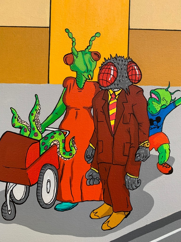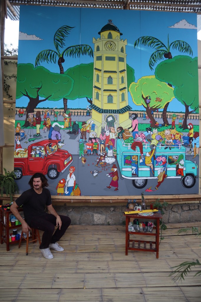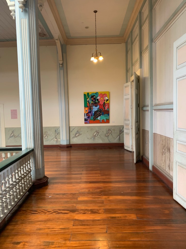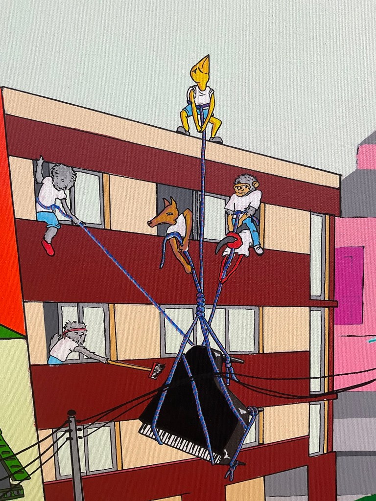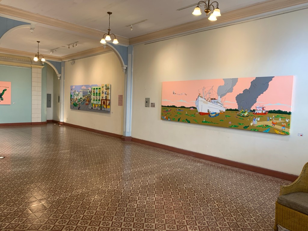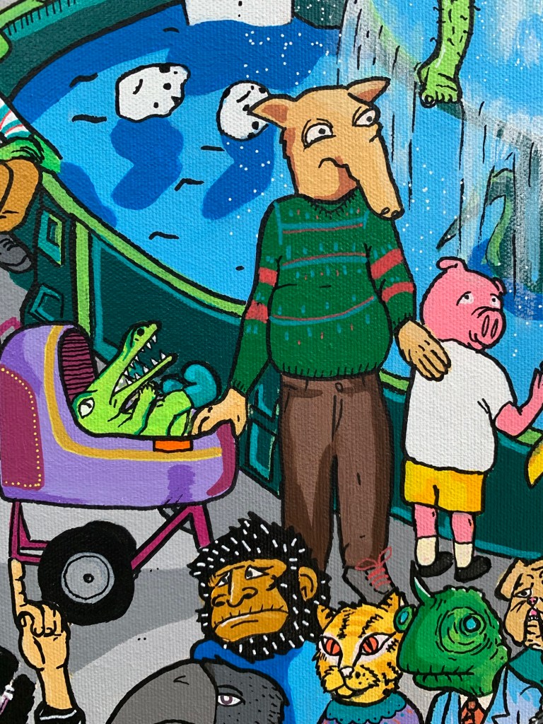 Ciudad Manglar holds together stories of commonplace encounters that shape public life in Guayaquil. The collection magnifies the multiple, often contradictory, characters of the city – their dress, customs, attitudes, narratives and how their subjective qualities bump up against each other and perform in ironic ways. A series of visual scenarios, the collection inherits and recharacterizes the tensioned socio-political undercurrents of Guayaquil by paying attention to the often overlooked minor details of this place. With bright color and humor, the paintings enliven the contrasting realities that shape Guayaquil through aesthetic situations that are at once playful, perverse and particular.